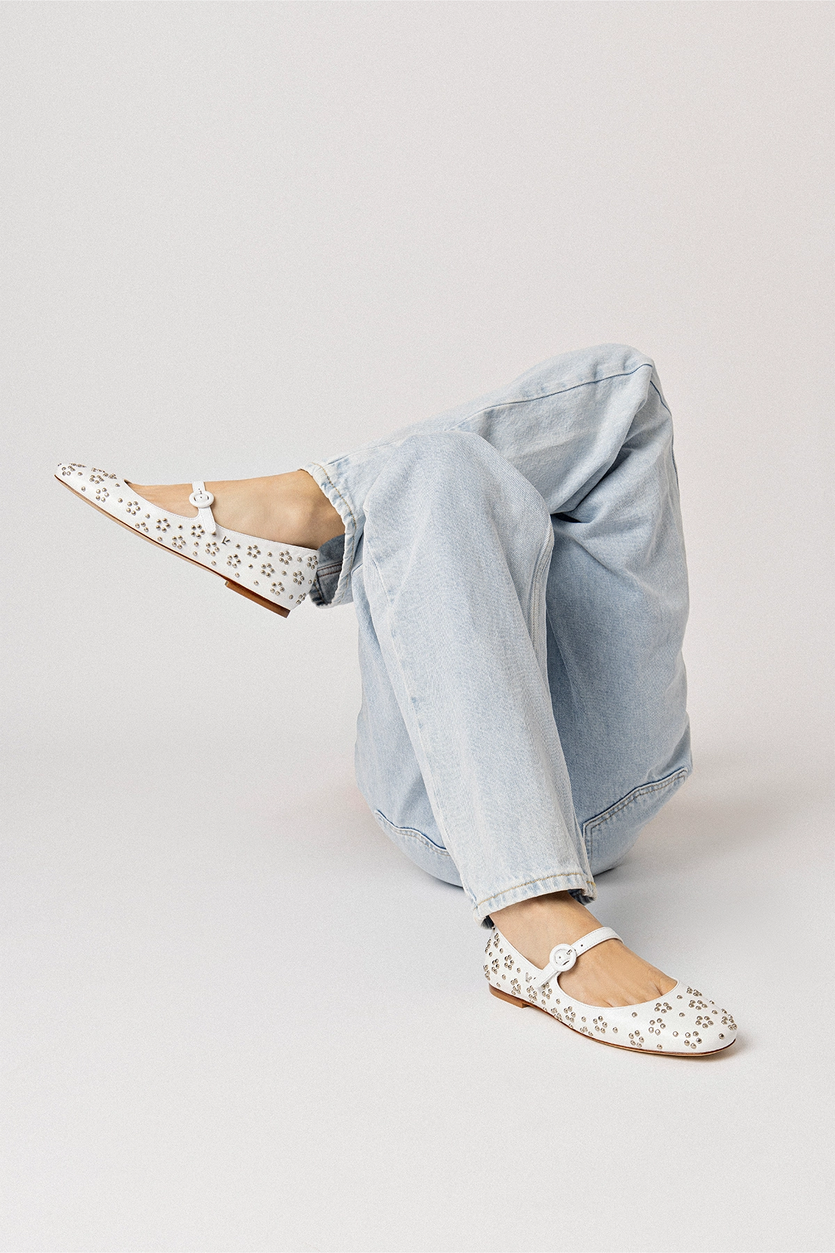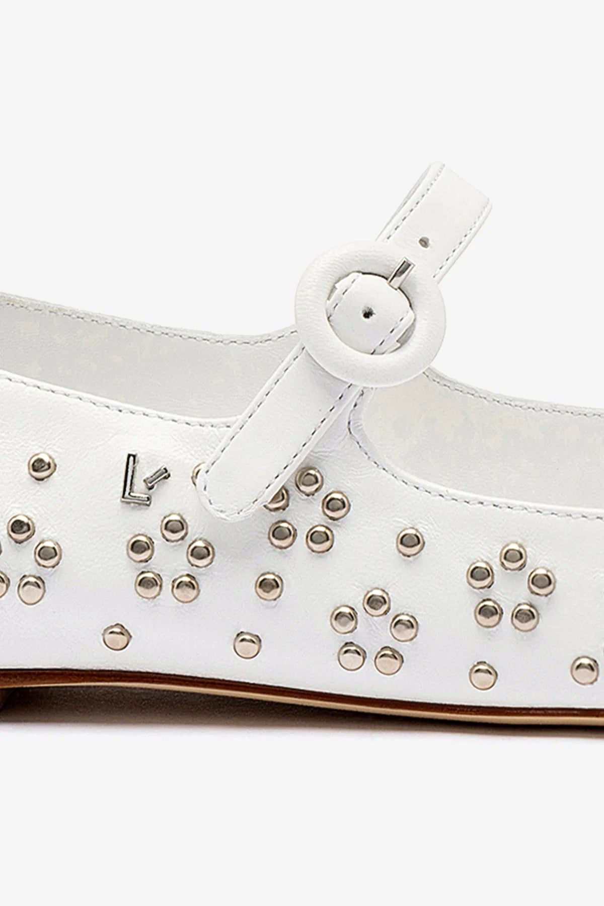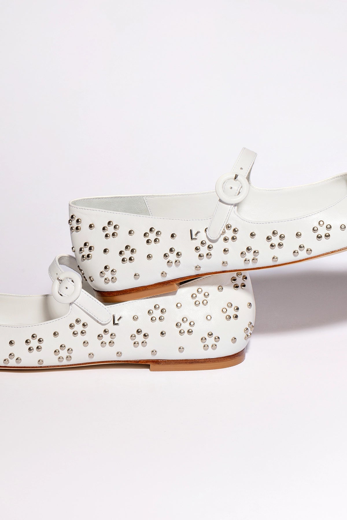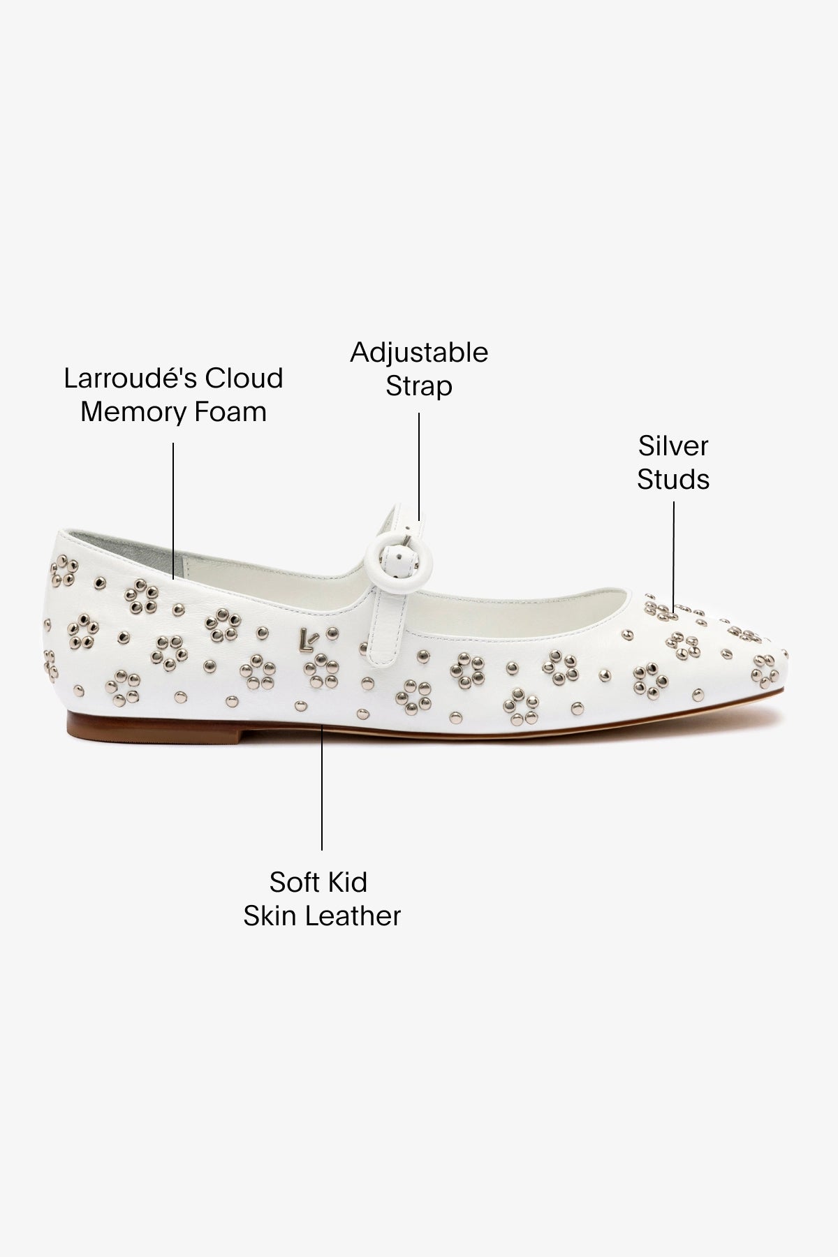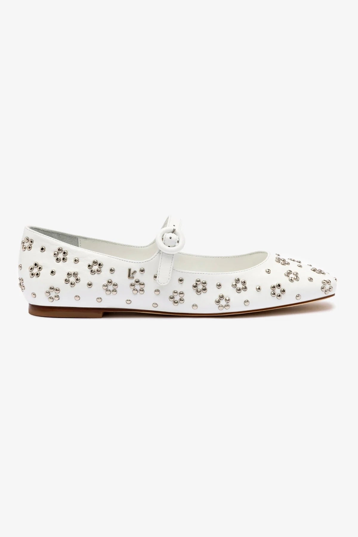 An adorable mary jane with modern details that keep it fresh, we’ve added chic silver studs to our favorite flat in a Summer-ready white leather that’s a bright spot this season and beyond. WhiteLuster kid skin Closed round toeSilver studsLarroudé “L” logo in golden hardwareFinely crafted leather sole for support, durability, and comfortInsole with memory foam cushion and hot stamp logoPeel off the protector before using your shoeHandmade in Brazil
