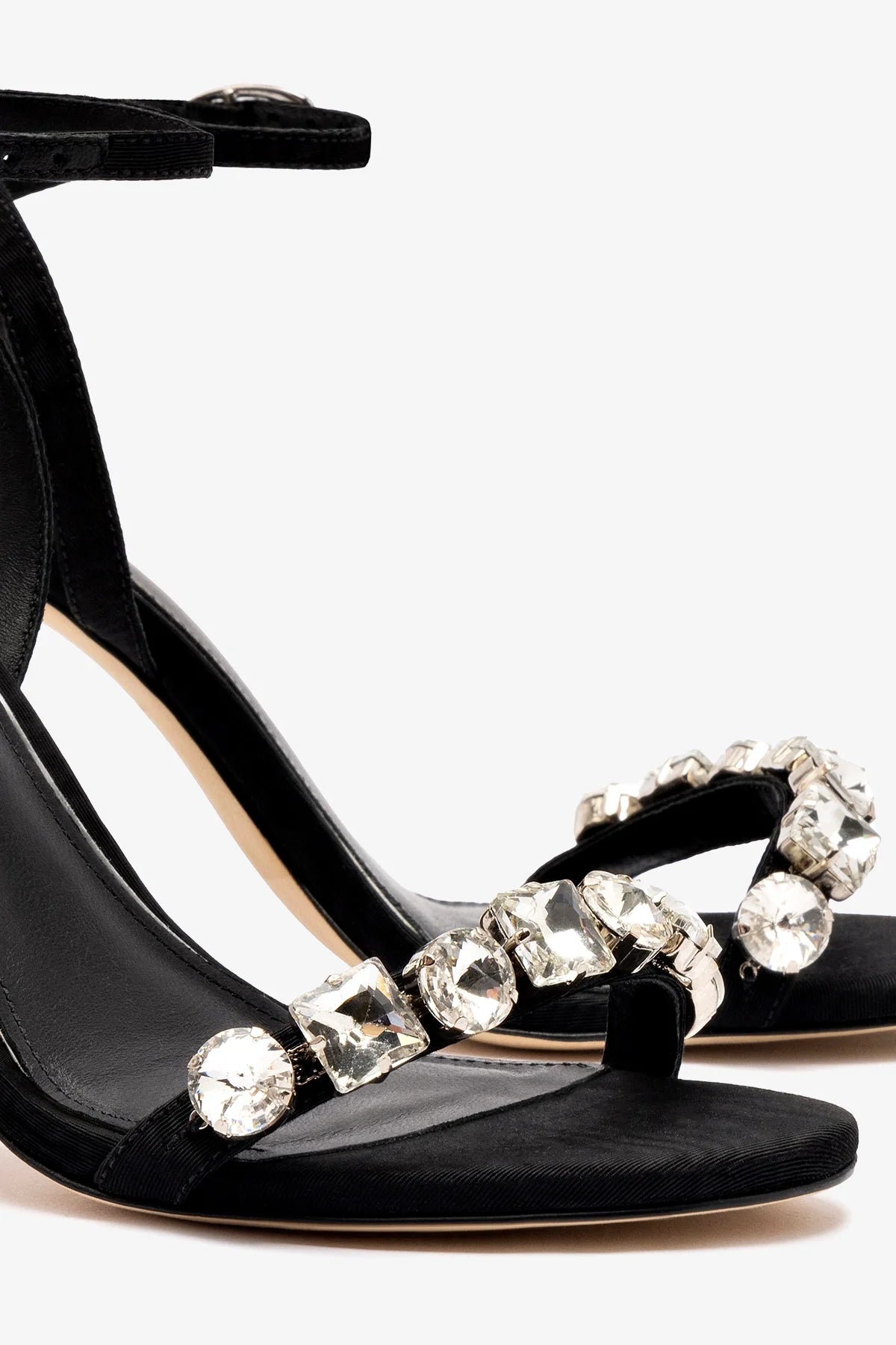 Hello, Calypso! An exciting addition to our evening edit, this new sky-high stiletto is ready to party. With oversized sequins adorning the slender strap across the toe, these shine bright and make a statement no matter what you’re wearing…or where you’re going. BlackArianna fabricOpen round toeAdjustable ankle strap 3.8 inch stiletto heelStone embellishmentFinely crafted leather sole for support, durability, and comfortInsole with memory foam cushion and hot stamp logoPeel off the protector before using your shoeHandmade in Brazil