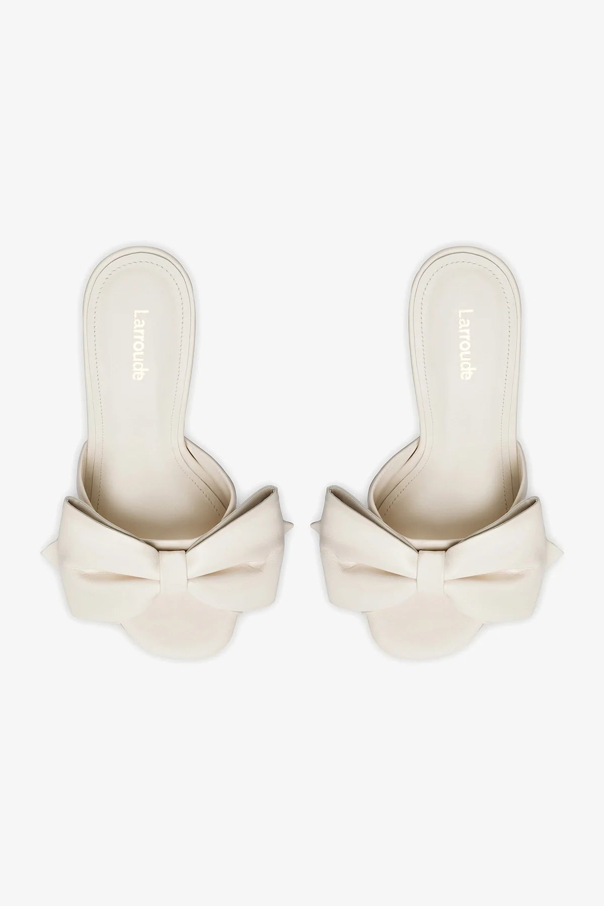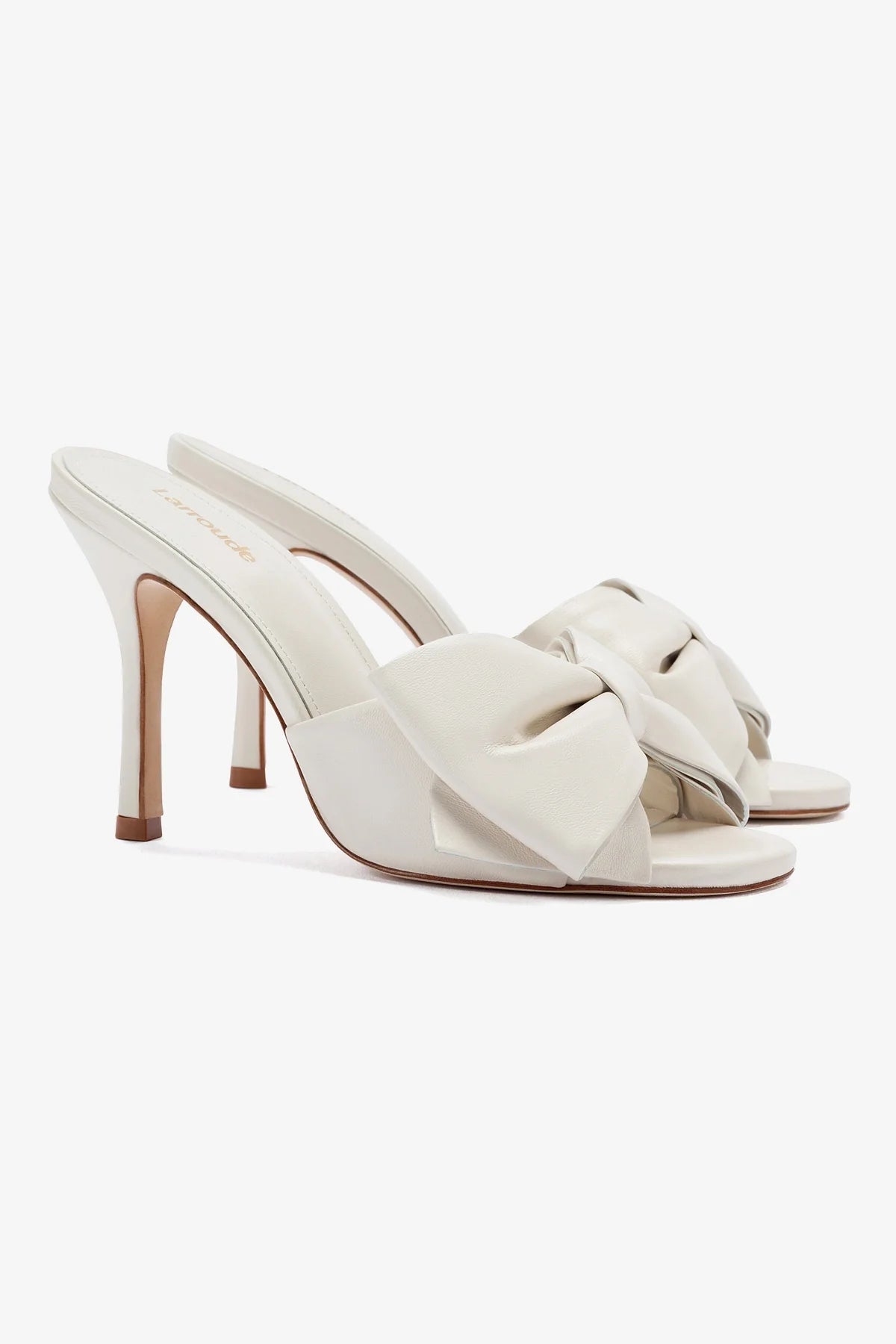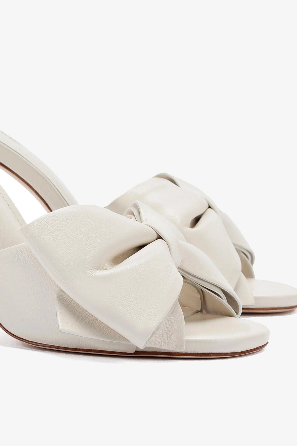 Like the chicest house slipper ever, reimagined for nights out, the Elle Mule is one for the ages. With a sweet hand-knotted bow to offset the sky-high stiletto heel, these feel both fresh and flirty.IvoryLuster kid skin leather Open round toe 3.8 inch stiletto heel Finely crafted leather sole for support, durability, and comfort Insole with memory foam cushion and hot stamp logo Handmade in Brazil