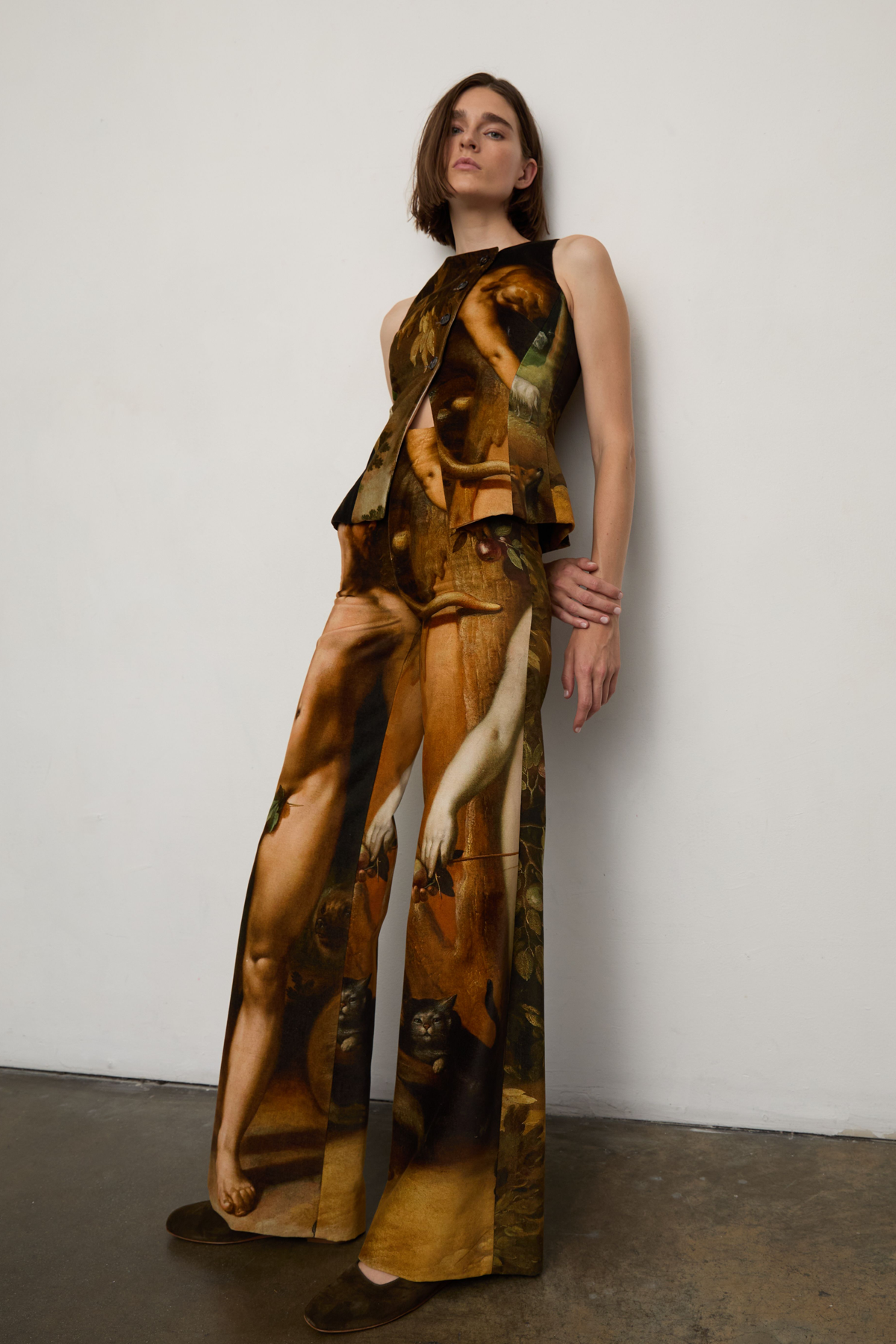 Wide leg trouser with front zip and hidden closure. Made from imported Italian cotton velvet. Artwork is from the painting The Fall of Man, 1592 by Cornelis van Haarlem. Fully lined.Fabric Imported from Italy100% Cotton Velvet100% Cupra-Rayon liningMade in Los AngelesCare: Dry Clean Only.Fit: Runs small. If between sizes, size up. Model is 5’9” and wearing size 2.A tree will be planted in California for every purchase made. PLEASE NOTE: THIS PRODUCT IS NOT ELIGIBLE FOR RETURNS. ALL SALES ARE FINAL