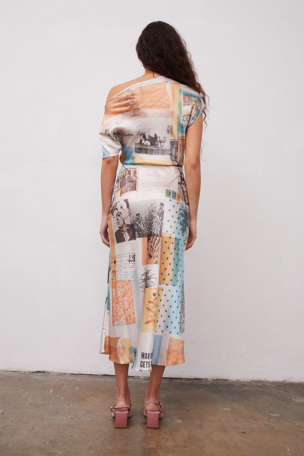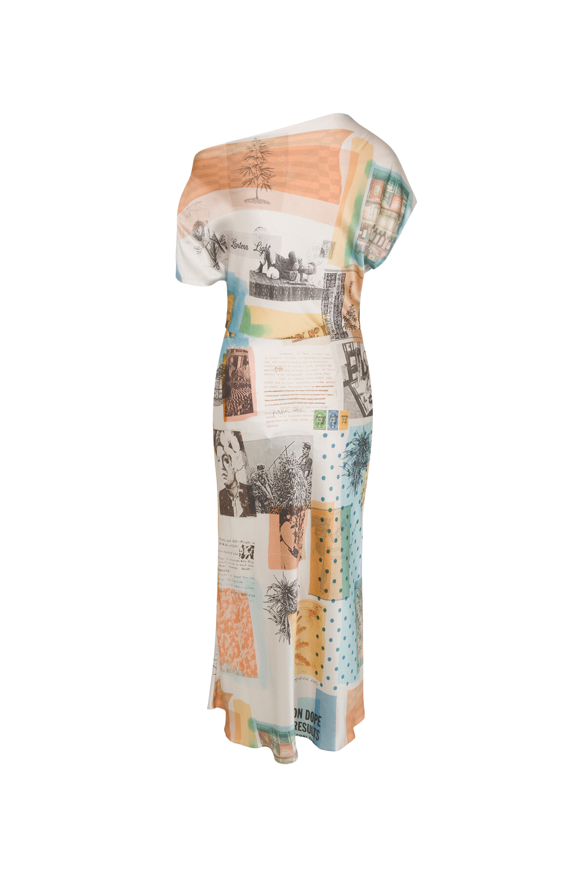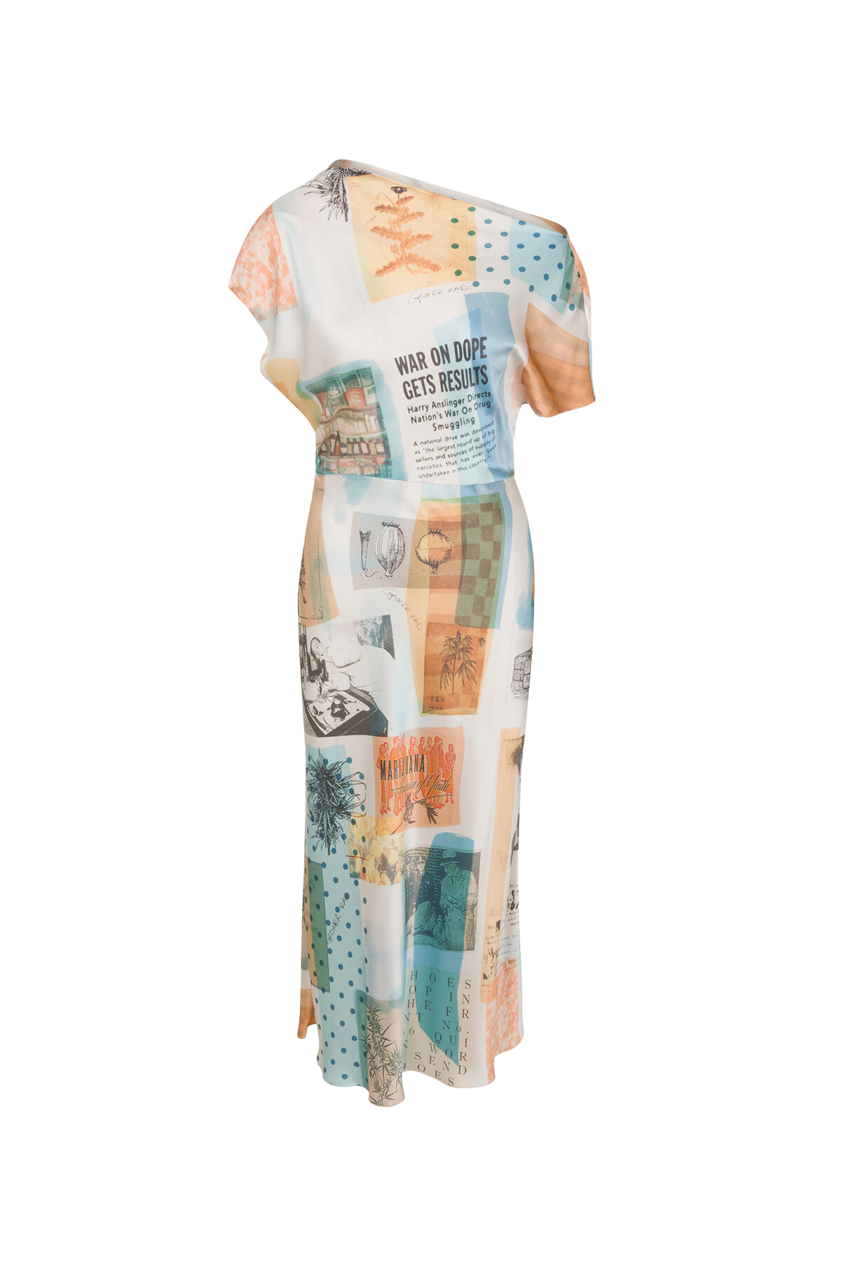 Bias cut silk dress with an asymmetrical draped neckline and fitted waist. Print features collaged Grover Rad original artwork of historical photographs, drawings, and drug propaganda. Due to the nature of the artwork, each garment will vary slightly in print placement making each piece unique.100% Silk CharmeuseInterior grosgrain beltMade in Los AngelesCare: Dry Clean OnlyFit: Model is 5’9” and wearing a Small.