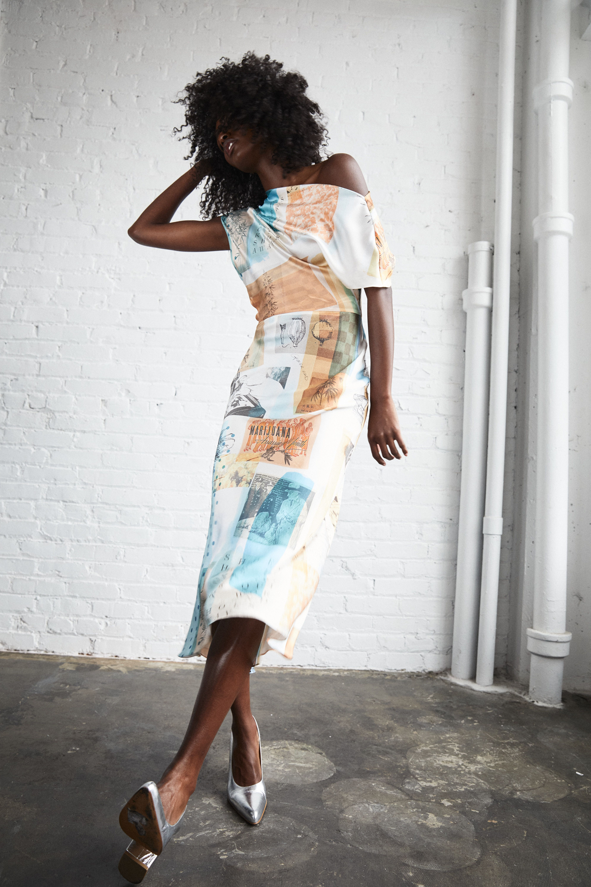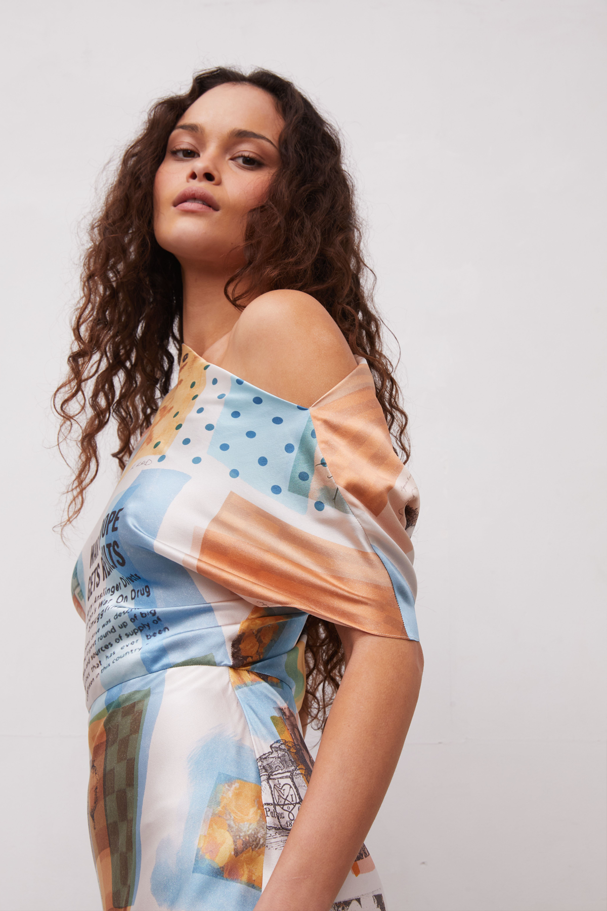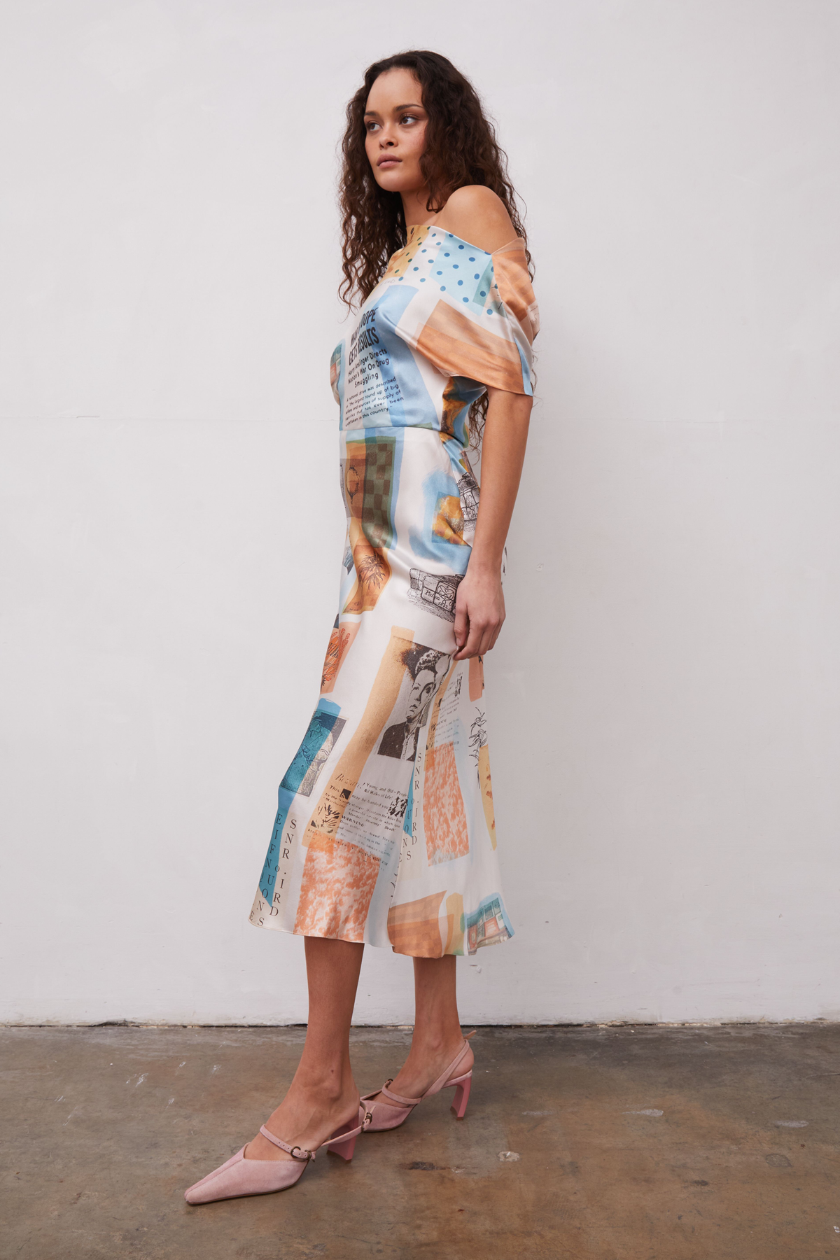 Bias cut silk dress with an asymmetrical draped neckline and fitted waist. Print features collaged Grover Rad original artwork of historical photographs, drawings, and drug propaganda. Due to the nature of the artwork, each garment will vary slightly in print placement making each piece unique.100% Silk CharmeuseInterior grosgrain beltMade in Los AngelesCare: Dry Clean OnlyFit: Model is 5’9” and wearing a Small.