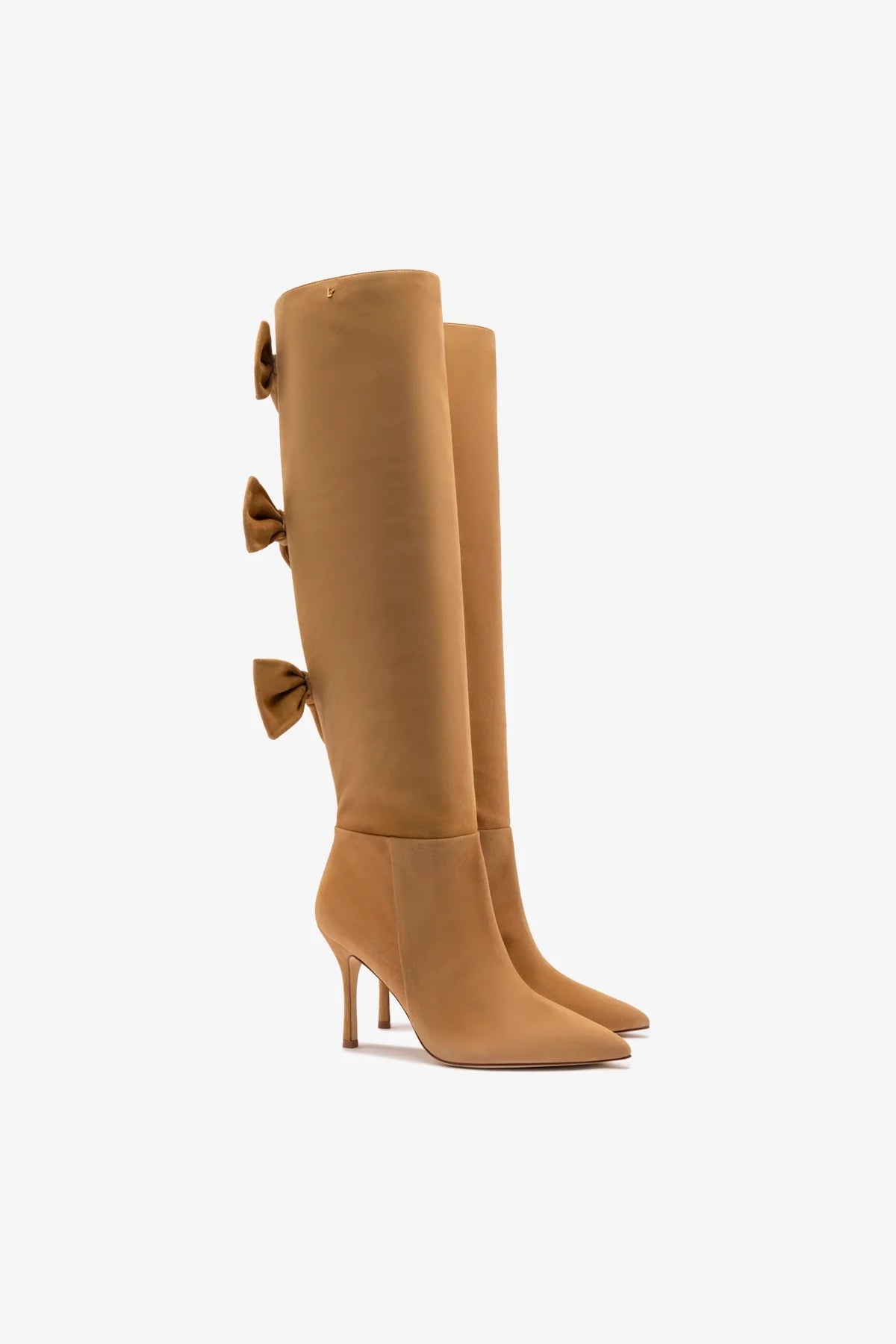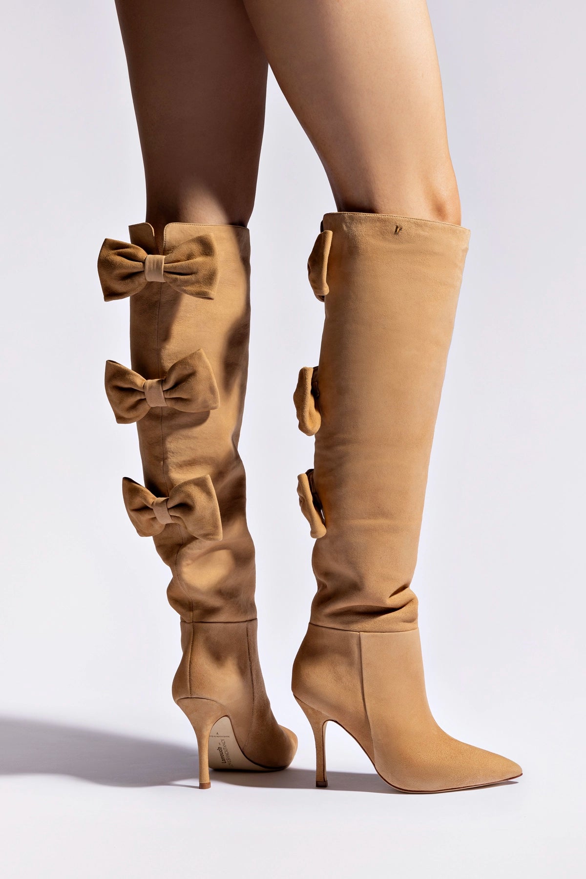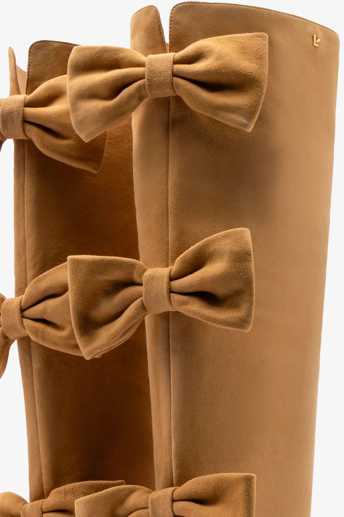 Designed together with LoveShackFancy, this reimagining of our bestselling Kate boot brings their unmistakeable femininity to our iconic silhouette. In a beautiful powder blue suede, we added sweet bows to the back of the shaft that leave a lasting impression.PeanutLush suede leatherClosed pointed toe3.8 inch stiletto heelLarroudé “L” logo in golden hardwareFinely crafted leather sole for support, durability, and comfortInsole with memory foam cushion and hot stamp logoHandmade in Brazil