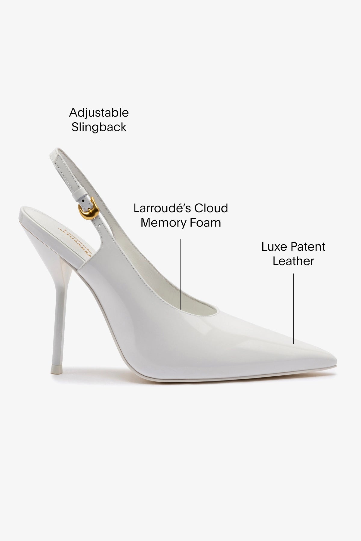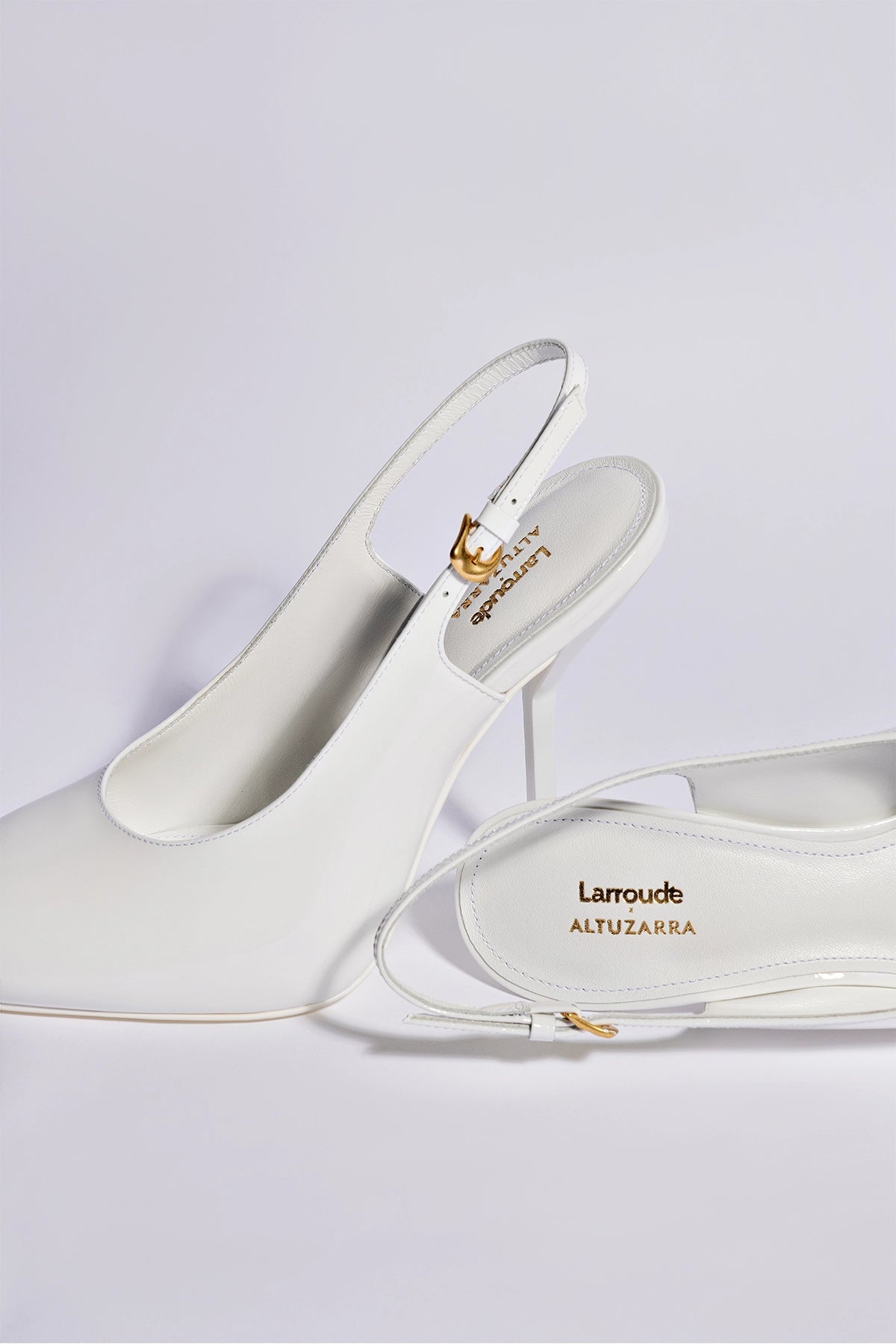 “I’ve been a friend and fan of Joseph’s since his first ever collection debuted. I’m a huge admirer of his work and it’s been a dream to collaborate and marry his expressive design ethos with what Larroudé does best.” -MarinaOur second recoloring of this bestselling collaboration, this new exclusive bright white patent leather version is as sleek as it gets with the sexy attitude Altuzarra women possess in spades.WhiteSoft patent leatherClosed pointed toeAdjustable ankle straps4.1 inch stiletto heelFinely crafted leather sole for support, durability, and comfortInsole with memory foam cushion and hot stamp logoHandmade in Brazil