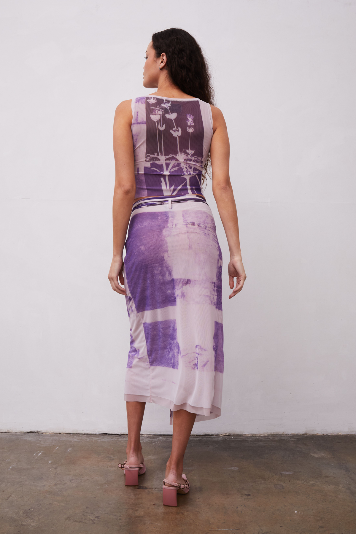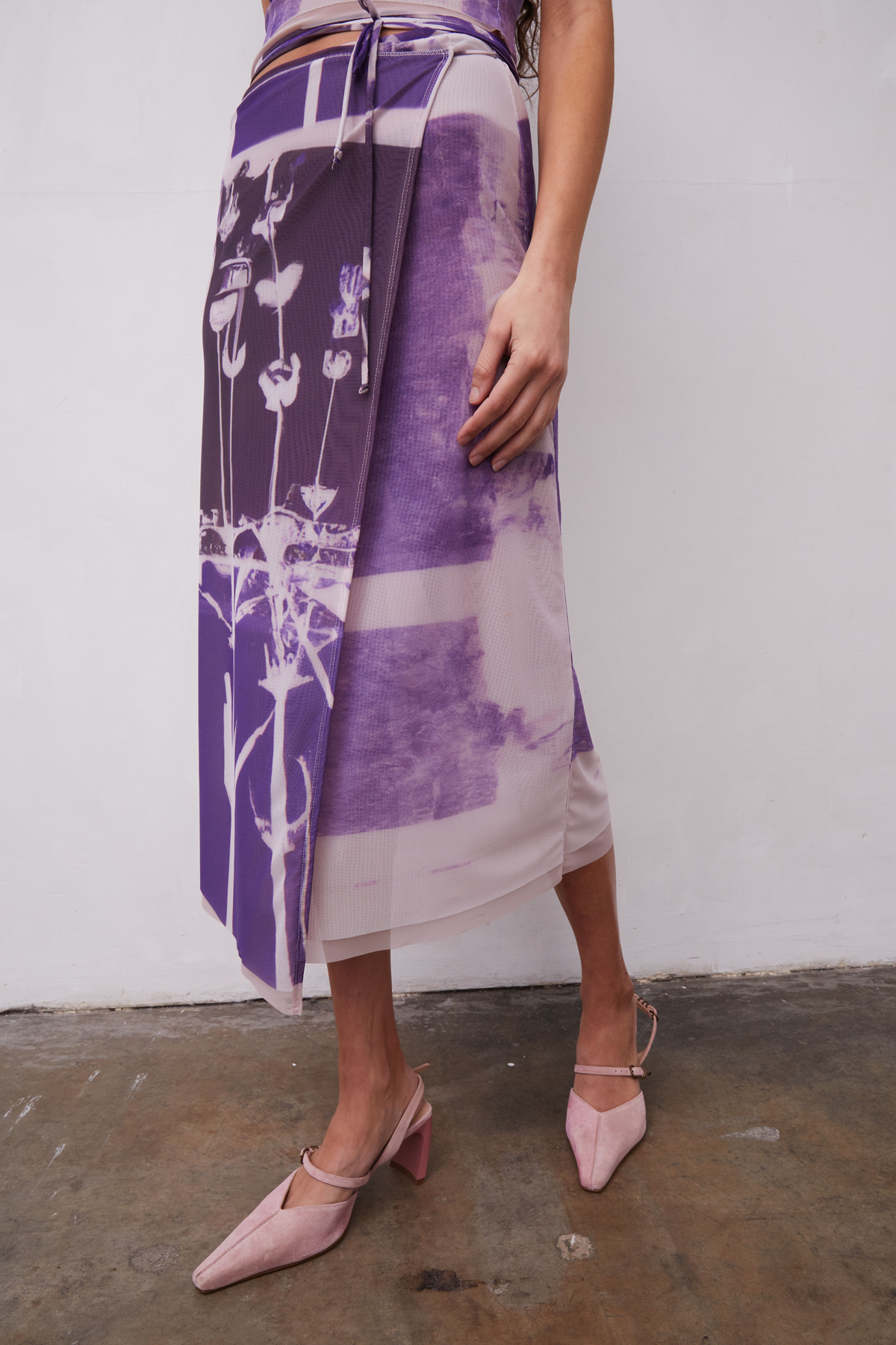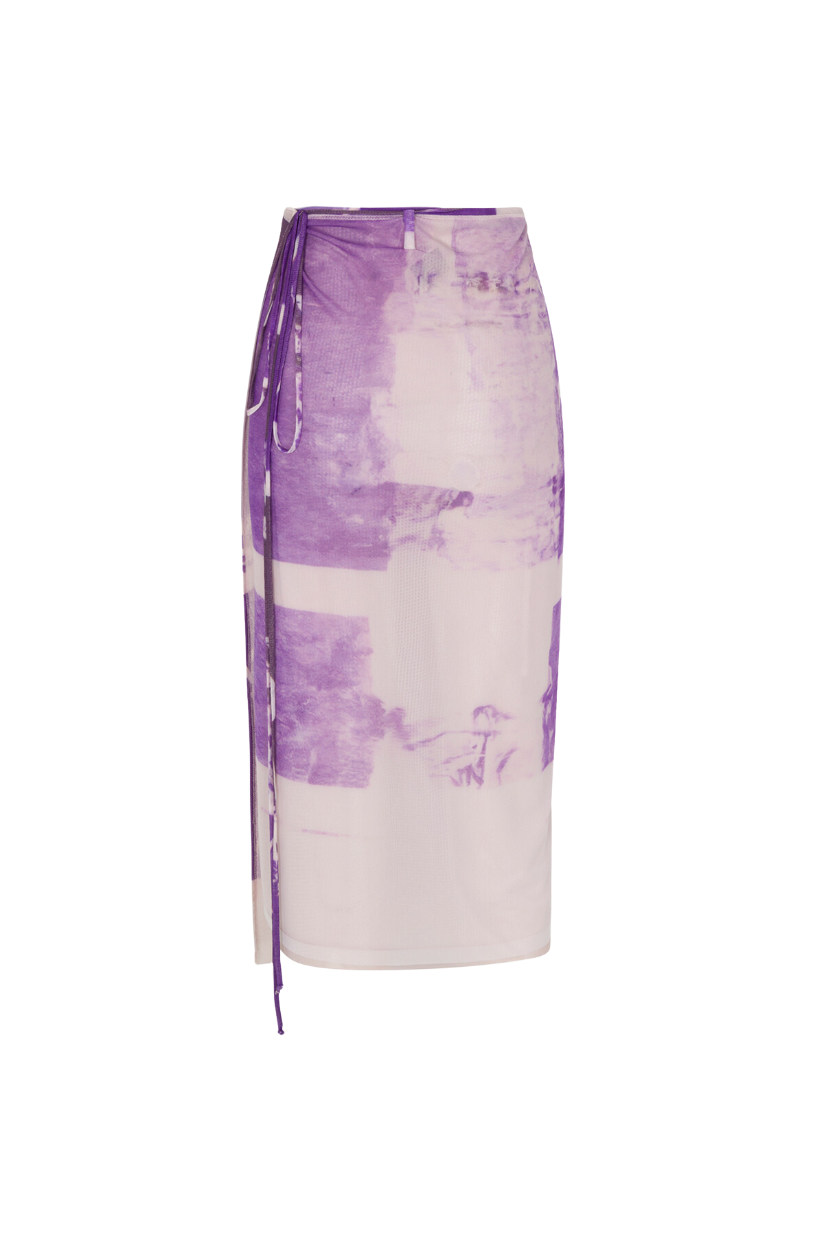 Mesh midi wrap skirt with exaggerated tie detail. Featuring abstracted poppy Grover Rad original artwork. Lined in lavender mesh.Mesh Imported from France92% Polyamide/ 8% LycraLining 90% Poly/ 10% SpandexMade in Los AngelesCare: Hand Wash Only and Hang DryFit: Model is 5’9” and wearing an X-Small.