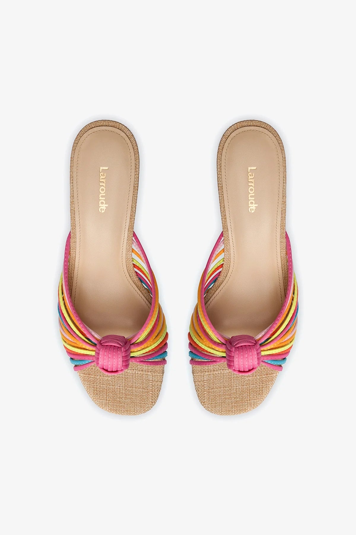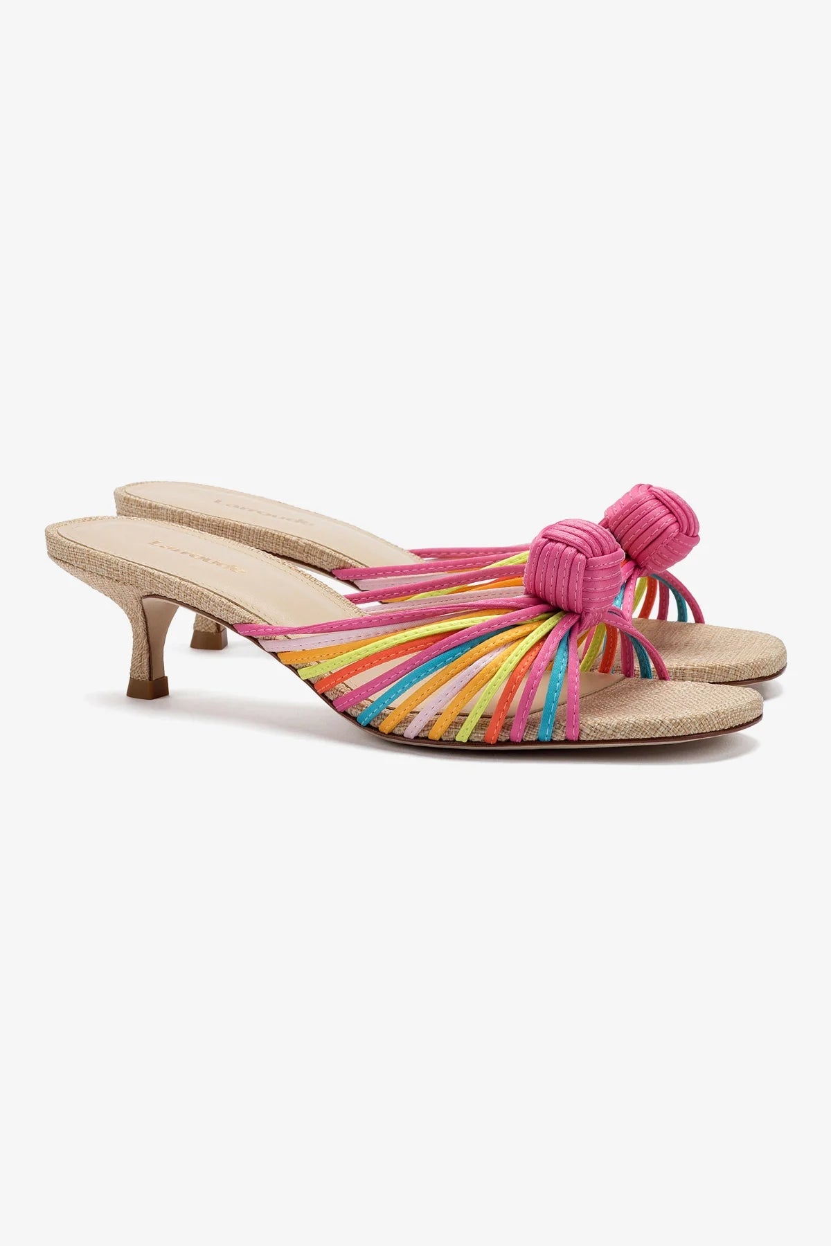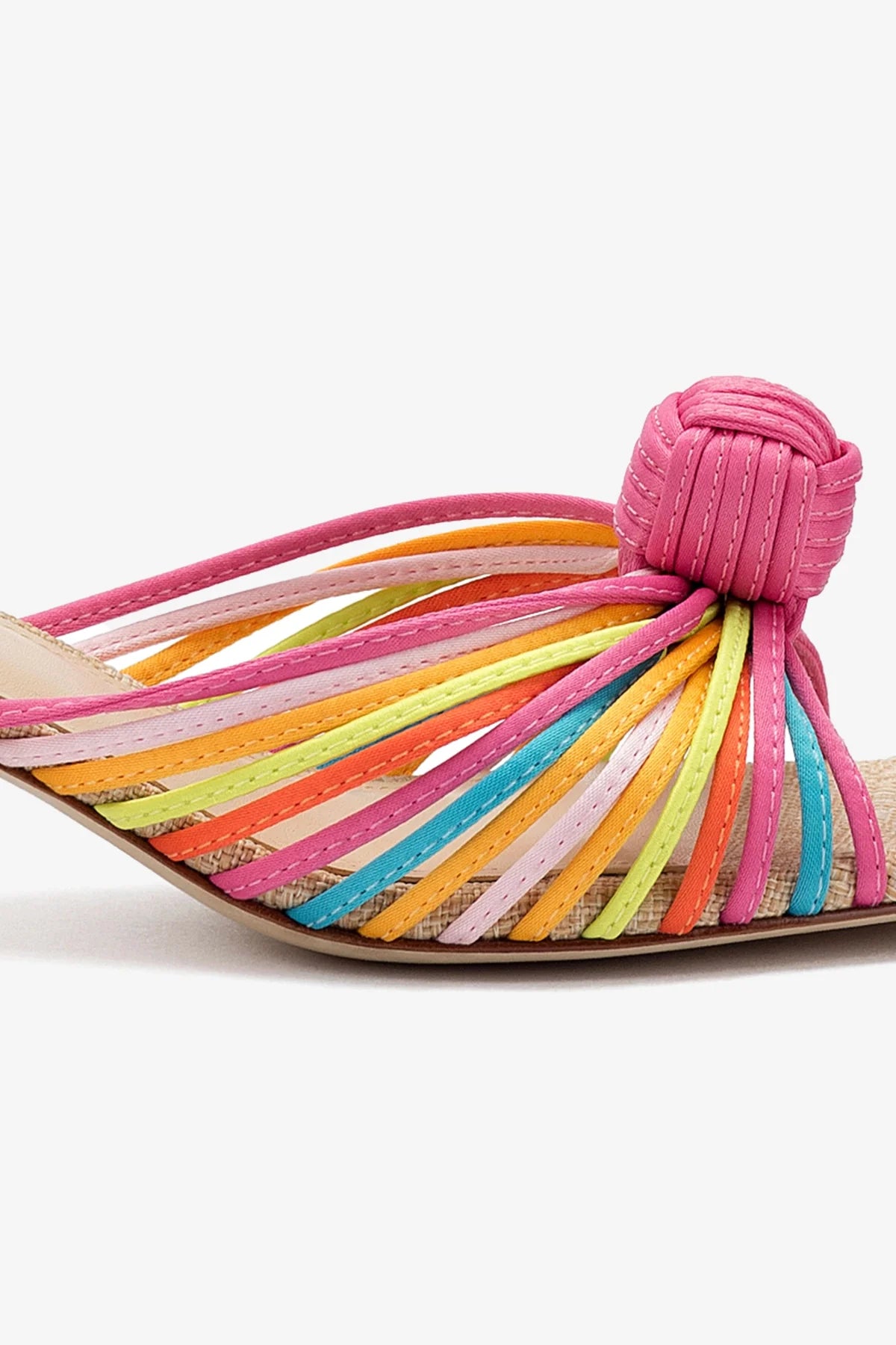 A riff on our bestselling Valerie heel, this new mule is just as fun and flirty with a playful twist. Slide these heeled sandals on and revel at their knotted detail in a gorgeous new pairing of satin and colored raffia that’s begging for a warm-weather vacay…so are we.Multicolor Satin Fabric Open round toe Adjustable ankle strap Non-detachable round ornament 1.8 inch stiletto heel Finely crafted leather sole for support, durability, and comfort Insole with memory foam cushion and hot stamp logo Handmade in Brazil