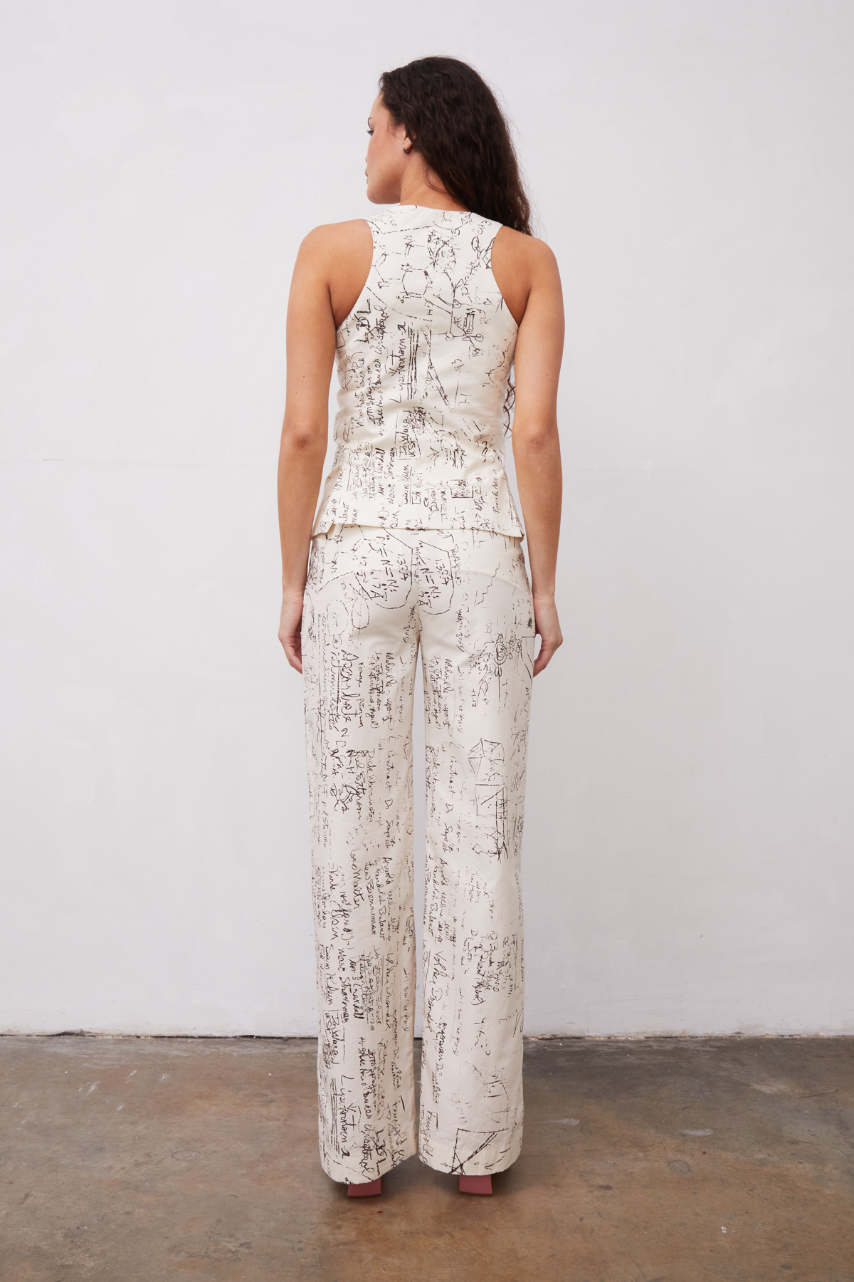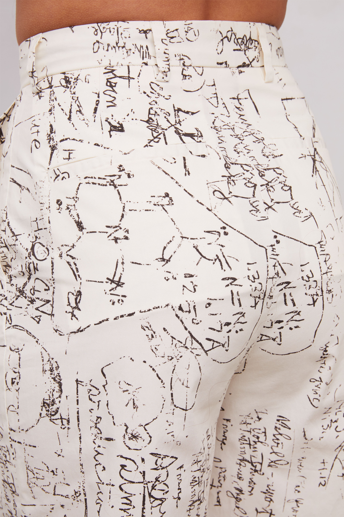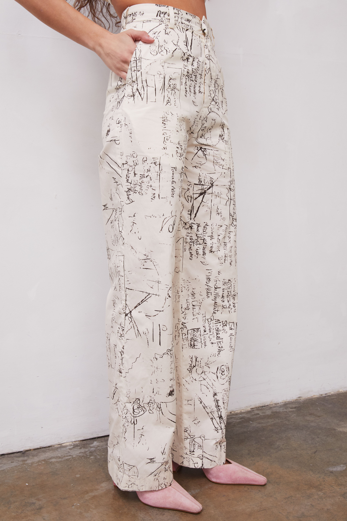 Cotton poplin tailored trouser with cotton pocketing. Lined in 100% cotton. Print features a vintage photo of a scientific chalkboard.Fabric Imported from Italy 100% Cotton 32” Inseam (size 4) Zip FrontHook and Bar ClosureMade in Los AngelesCare: Dry Clean OnlyFit: True to size. Model is 5′ 7″ and wearing a size 2.A note from GR: Ying Yang, named after LSD’s street name, was inspired by Albert Hofmann’s work, a scientist who discovered LSD accidentally in his laboratory. His discovery advanced mental health work before it was made illegal in the 1960s with the counterculture movement and their recreational use. Hofmann called LSD “medicine for the soul”.