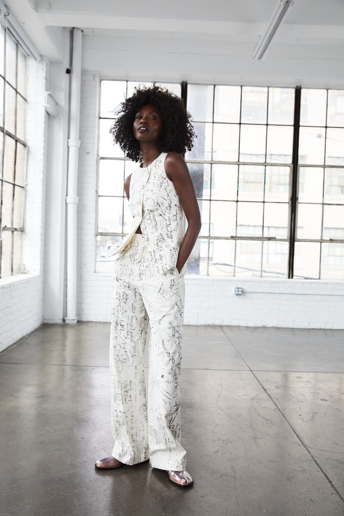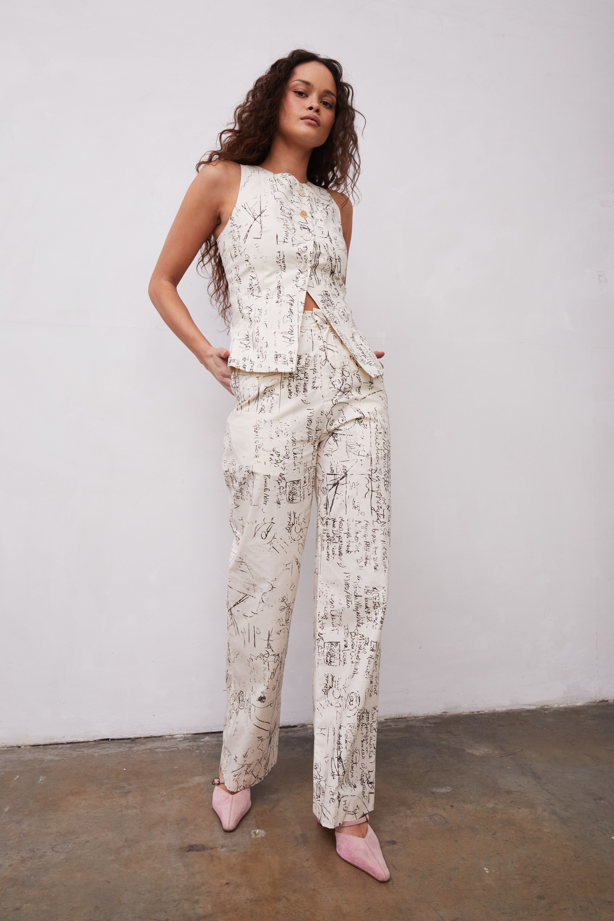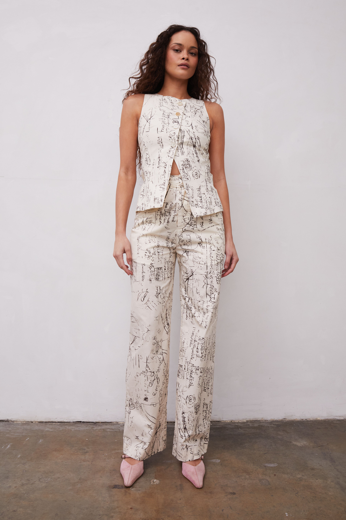 Cotton poplin tailored trouser with cotton pocketing. Lined in 100% cotton. Print features a vintage photo of a scientific chalkboard.Fabric Imported from Italy 100% Cotton 32” Inseam (size 4) Zip FrontHook and Bar ClosureMade in Los AngelesCare: Dry Clean OnlyFit: True to size. Model is 5′ 7″ and wearing a size 2.A note from GR: Ying Yang, named after LSD’s street name, was inspired by Albert Hofmann’s work, a scientist who discovered LSD accidentally in his laboratory. His discovery advanced mental health work before it was made illegal in the 1960s with the counterculture movement and their recreational use. Hofmann called LSD “medicine for the soul”.